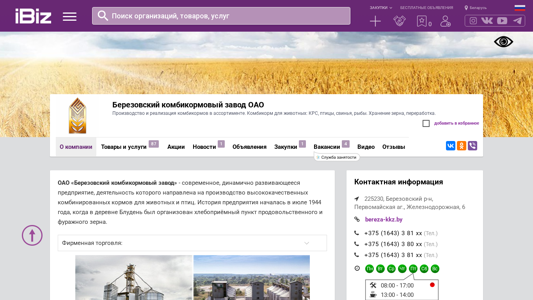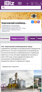 | AI-анализ | The website is for Berezovsky Combined Feed Mill OAO, a company specializing in the production and sale of animal feed for various livestock, including cattle, poultry, swine, and fish. The site provides information about the company's services, products, and contact details. Keywords associated with the website include 'combined feed', 'livestock', 'poultry', 'swine', 'fish', 'production', 'sale', 'grains', and 'storage'. The company's history began in 1944 as a grain reception point for food and fodder crops. The website includes contact information for multiple locations and storefronts, including addresses, phone numbers, and operating hours. |