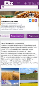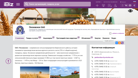 | AI-анализ | The website is for Peсковское OAO, a Belarusian agricultural company producing, processing, and selling agricultural products. The company specializes in milk and meat production, and also grows grains, legumes, potatoes, and sugar beets. The website includes a section for free classified ads. The company's address and contact phone numbers are provided. Peсковское OAO has a land area of 7,775 hectares, with 4,356 hectares used for agricultural purposes, including 2,667 hectares of arable land, 1,479 hectares of hayfields, and 210 hectares of pastures. The soil fertility index is 33.5 for agricultural lands and 33.5 for arable land. The company offers for sale milk, meat, grain, legumes, and |