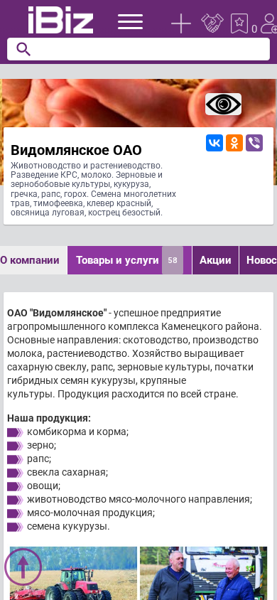 | Название / Заголовок | Видомлянское ОАО - Животноводство и растениеводство. Разведение КРС, молоко. Зерновые и зернобобовые культуры, кукуруза, гречка, рапс, горох. Семена многолетних трав, тимофеевка, клевер красный, овсяница луговая, кострец безостый.. 225067, , Видомля аг., Школьная, 4 |