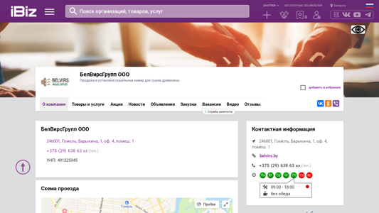 | AI-анализ | This online resource is dedicated to BelVirсGрупп ООО, a company based in Belarus, specifically located in Goмель at Барыкина, 1, оф. 4, помеш. 1. The company specializes in the sale and installation of drying chambers for drying wood. The contact details, including a phone number starting with '375 29' and the Unified State Register number '491325945', are provided. The opening hours are mentioned as Monday to Friday from 9:00 to 18:00, with no breaks for lunch. The company's offerings fall under the categories of 'Деревообработка, оборудование' (wood processing, equipment) in the Yandex business catalog. |