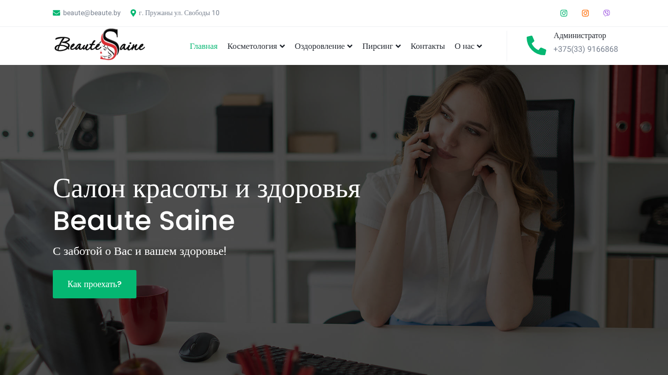 | AI-анализ | This online resource is a beauty and wellness salon named Beaute Saine, located in Pruzhany, Belarus, at ul. Svoбоды 10. The salon offers a wide range of services including massage, cosmetology, piercing, tattoo, manicure, and more, with qualified professionals. They also have a large assortment of Korean cosmetics. The salon provides various treatments such as RF-lifting, Elos epilation and rejuvenation, carbon peeling, ultrasonic cleansing, laser tattoo removal, and others. There are also health and wellness offerings like Bioptron, lymph drainage, anti-cellulite programs, cedar barrel saunas, and carbon therapy. The salon has a contact number of +375(33) 9166868 |