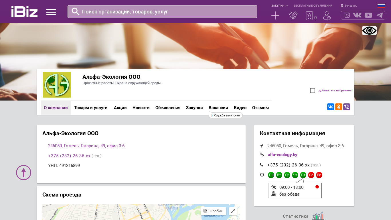 | Название / Заголовок | Альфа-Экология ООО - Проектные работы. Охрана окружающей среды.. 246050, Гомель, , Гагарина, 49, офис 3-6 |