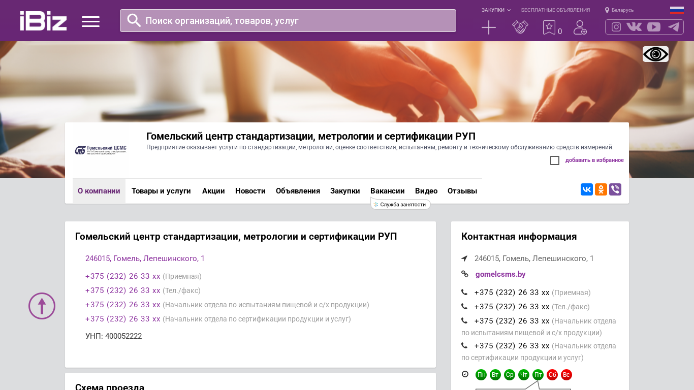 | AI-анализ | The website is a business platform for Gomeльский центр стандартизации, метрологии и сертификации РУП, a company based in Гомель, Belarus, that offers services related to standardization, metrology, evaluation of conformity, testing, repair and technical support for measuring instruments. The website provides information on the company's services, contact details and location. Keywords associated with the website include "услуги" (services), "стандартизация" (standardization), "сертификация" (certification), "продукции" (products), "средств" (instruments), "232" (a local phone code), "метрологии" (metrology), "сертификации" (certifications), "закупки" (purchases), "объявления" (announce |
