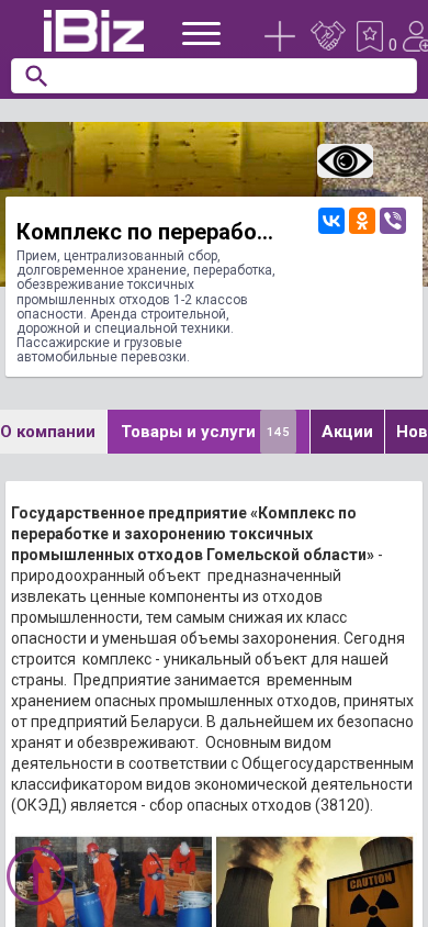 Название / ЗаголовокКомплекс по переработке и захоронению токсичных промышленных отходов Гомельской области КУП - Прием, централизованный сбор, долговременное хранение, переработка, обезвреживание токсичных промышленных отходов 1-2 классов опасности. Аренда строительной, дорожной и специальной техники. Пассажирские и грузовые автомобильные перевозки.. 230023, Гомель, , Тельмана, 4