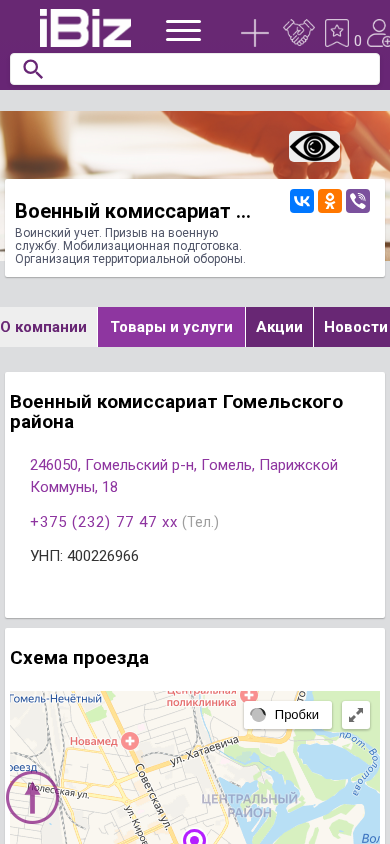 | Название / Заголовок | Военный комиссариат Гомельского района - Воинский учет. Призыв на военную службу. Мобилизационная подготовка. Организация территориальной обороны.. 246050, Гомель, , Парижской Коммуны, 18 |