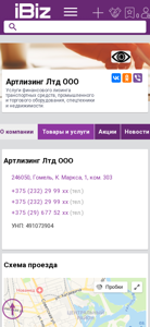 | AI-анализ | The website is a Belarusian business platform offering financial leasing services for transportation vehicles, industrial and commercial equipment, specialized technology, and real estate. The company, Artleasing Ltd OOO, is located in the city of Homel, Belarus, at the address К. Маркса, 1, ком. 303. Contact information includes phone numbers +375 (232) 29 99 xx and +375 (29) 677 52 xx. The company's Unified State Register number is 491073904. Business hours are from 9:00 am to 6:00 pm, Monday through Friday, with Saturdays and Sundays being holidays. The website includes sections for company information, products and services, news, job listings, and customer reviews on VKont |