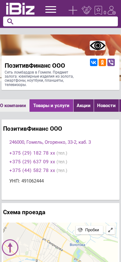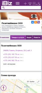 | AI-анализ | The website is a business based in Gomele, Belarus, specializing in lending services for various items such as jewelry, smartphones, laptops, tablets, and televisions. The company, named PositiveFinance OOO, has multiple contact telephone numbers: +375 (29) 182 78 xx, +375 (29) 637 09 xx, and +375 (44) 582 78 xx. It is located at Огоренко, 33-2, каб. 3, 246000, Goemele. The business operates from Monday to Saturday, 10:00 AM to 19:00 PM, with no breaks for lunch. The website provides information on the company's location, contact details, and operating |