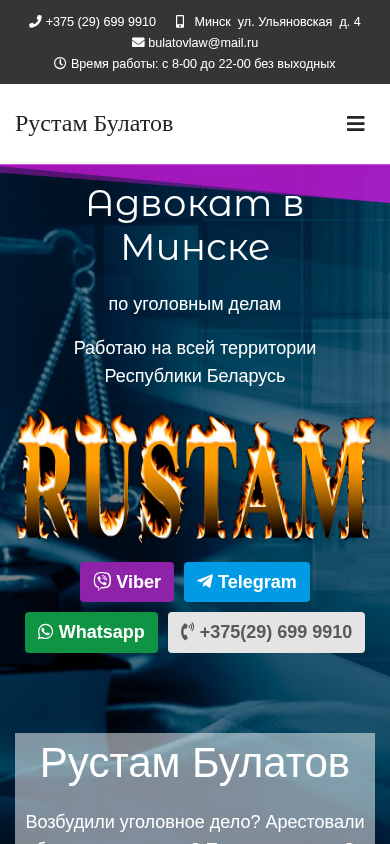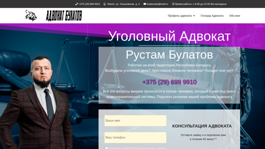 | AI-анализ | The web project "Advokat po ugolnym delam - Advokat v Minske (Lawyer for Criminal Cases - Lawyer in Minsk)" is a website of a criminal defense lawyer based in Minsk, Belarus. The lawyer, Rustam Bulatov, offers professional services for criminal cases, including theft, traffic accidents, drug-related offenses, and more. He guarantees high-quality defense of clients' rights. The lawyer is available 24/7 and can make an operational visit to clients in all regions of Belarus. Clients can contact him via phone +375 (29) 699 9910, email bulatovlaw@mail.ru, or through Viber, Telegram, or WhatsApp. The website provides information about the lawyer's profile, services, and contact information. The |