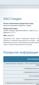 | AI-анализ | This online resource, sandal.epfr.by, is the official website of Closed Joint-Stock Company "Sandal" (UNP 200019413) in the global computer network Internet. It provides information on the activities of the company. The website contains downloadable information on the reorganization or liquidation of the company and its affiliated and dependent economic organizations, as well as the formation of the register of owners of valuable securities on various dates. Additionally, there is information on the payment of dividends, the formation of the register of owners of valuable securities, and significant transactions involving the company's own stock emissions. |