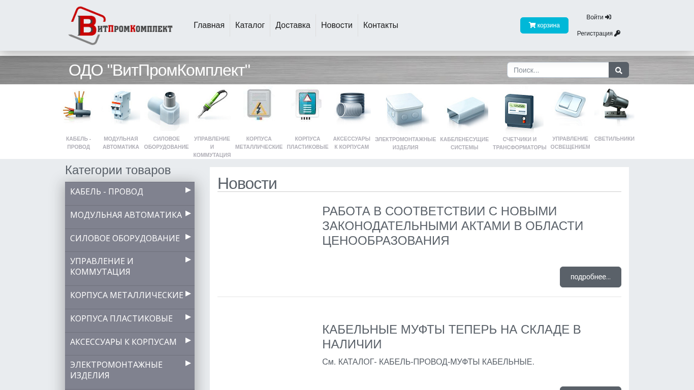 | SEO-описание | ОДО "ВитПромКомплект" существует на рынке электротехнической продукции с 2004 года и является оптовым поставщиком данной продукции ведущих компаний России, Республики Беларусь и зарубежных производителей, поставщиком кабельной продукции. |
