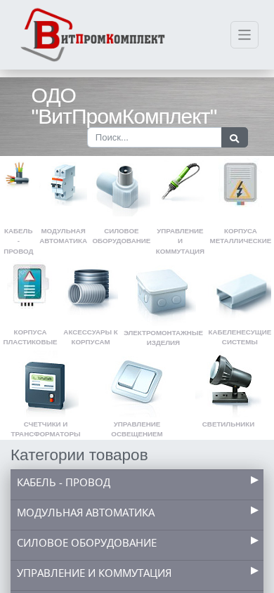 | AI-анализ | --- The portal VitPromKomplekt is an optop buyer of electrical products since 2004. It is a supplier for leading Russian, Belarusian, and foreign manufacturers' electrical products, including cable products. The website offers a catalog, delivery, news, contacts, and a shopping cart. Key product categories include cabling, fuses, switches, and metal and plastic housings, among others. The top searched words are "corpus," "выключатели," "accessories," "metallic," "светильники," "budget," "одо," "витпромкомплект," "провод," "управление," "autmatic," "metallorukav," "лотки," "375," "кабель," "автоматика," "электromontazhnye," "счет |