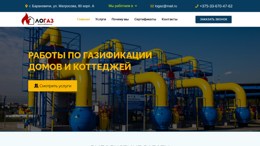 | AI-анализ | --- This website is dedicated to gasification services for homes and cottages in the cities of Baranovichi and the corresponding address 80, Matrosova Street, Corp A. The company operates in the following regions and districts: 1. Brest Oblast: Baranovichi, Lyahevichy, Gantsavichy, Luninetsy, Shtolin districts. 2. Minsk Oblast: Slutsk, Soligorsk, Starodorozh, Moldetchn, Kopil, Nesvizh, Klets, Stolbtsov, Dzerzhinsk districts. 3. Grodno Oblast: Slonim, Novogrudok, Dytlov districts. The company may also work in other districts. The contact details for the company are logaz@mail.ru and |
