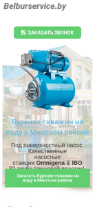 | AI-анализ | The website Belburservice.by offers water well drilling services in the Minsk region. The company has experience of 10 years and provides drilling under the surface water pump. The drilling price starts from 750 rubles and includes the installation of a 32mm pipe and filter. The website also mentions the availability of quality submersible pumps Omnigena & IBO 32. The drilling process includes the fitting, reverse valve, and water pump crane, and the cost depends on the foundation depth and house material. The website allows users to leave a request for a callback. The reviews section includes testimonials from satisfied clients who praise the professionalism and quality of the services. One client, Vasily Dzerzhinsky, expresses his appreciation for the clean and tasteful water from his well, while Anatoly Ivanovich from Novopolotsk shares his |