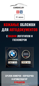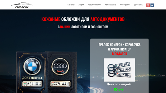 | AI-анализ | The web project cardoc.by offers leather covers for auto documents. The website contains a catalog, information about deliveries, and a section for ordering. Each leather cover comes with a keychain, a box, and an aromatizer as a gift. Prices range from 50 rubles for standard covers, with different colors and materials available. Delivery options include self-pickup or shipping by mail, with varying costs and estimated delivery times. The company also accepts on-site payment and offers a discount for online orders. The website features customer reviews and contact information for inquiries. |