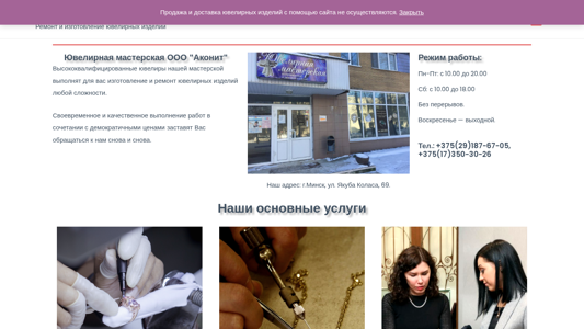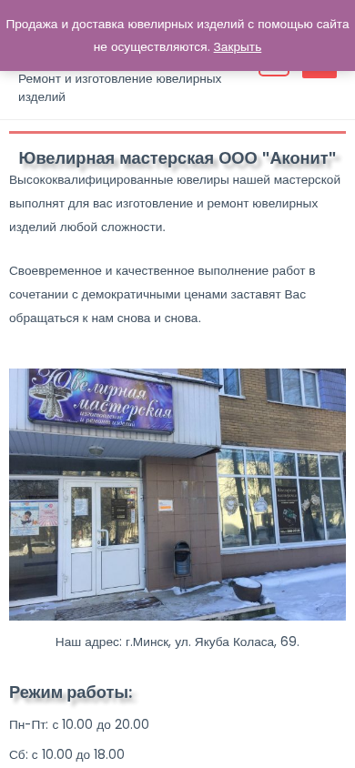| AI-анализ | This website is a jewelry workshop named "Аконит" offering repair and production of jewelry items. No sales or delivery of jewelry through the site are carried out. The main menu includes sections for 'Mastershop', 'Catalog', and 'Services'. The catalog features various types of jewelry such as rings, necklaces, bracelets, pendants, and more. The services section includes repair, consultation, and a unique 'stringing' service. The business is located in Minsk, Belarus, at ul. Якуба Коласа, 69, and operates Monday to Saturday from 10:00 to 20:00 and Sundays closed. Contact information includes phone numbers +375(29)187-67-05 and +375(17)350-30-26. The workshop specializes in creating and |