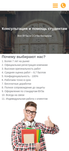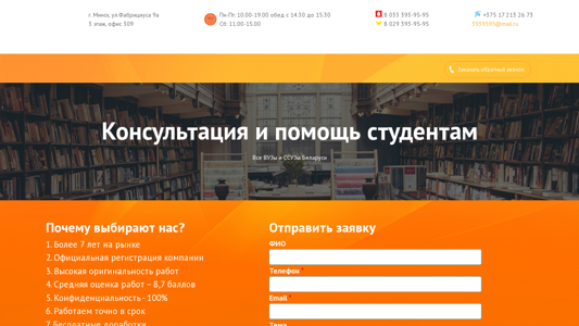 | AI-анализ | The website is an educational center in Minsk, Belarus, offering comprehensive help for students, graduates, and educational institutions. The contact details include two phone numbers, two email addresses, and a physical address on Fabriciusa Street. The center operates Monday through Friday from 10:00 to 19:00, with a break for lunch from 14:30 to 15:30, and on Saturdays from 11:00 to 15:00. The website provides consultation and assistance for students in all universities and colleges in Belarus. The center's selling points include over 7 years of experience, official company registration, high-quality original work, confidentiality, on-time delivery, free revisions, full support until thesis defense, and adherence to university standards. The website also offers both in-office and remote |