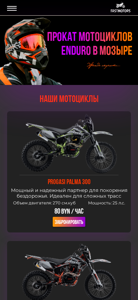 | AI-анализ | --- The web project Fastmotors.by is an online platform for motorcycle rentals in the city of Мозырь, Belarus. It offers Enduro motorcycles for rent, specifically the Progasi Palma 300 and 250 models. The website provides detailed information on the motorcycles' features, such as their engine size, horsepower, and cost per hour for rental. Visitors can also find information on available equipment, including safety gear and protective clothing, which is provided free of charge with motorcycle rental. The website includes a section for contact information and rental conditions, which detail the age, weight, and height requirements for renters, as well as the rules and restrictions for motorcycle usage. Additionally, the site offers a gift certificate as a purchasable item for those looking to give the experience of motorcycle riding as a gift. |