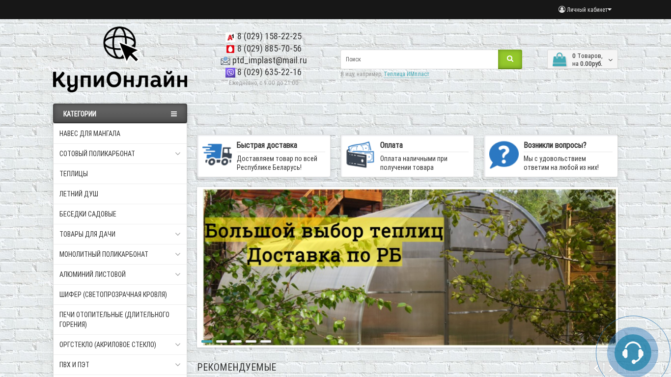 | SEO-описание | Интернет-магазин "КупиОнлайн". Мы продаем удобные, практичные и недорогие товары для получения удовольствия от своего сада, огорода или дачи. В основном это теплицы из поликарбоната, но занимаемся также продажей оргстекла, сотового поликарбоната, алюминия, нержавейки, навесов, беседок, садовых качелей, мангалов и других товаров. Работаем и трудимся на совесть, чтобы даже через 15 лет наши товары радовали глаз и давали богатый урожай. |