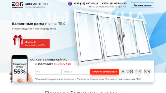 | AI-анализ | The portal eoplus.by offers balcony frames for sale. The website's title is "Балконные рамы" and the description includes keywords such as "рамы," "скидкой," and "узнать." The top words on the page are "рамы," "скидкой," "узнать," "стоимость," "-55," and "балконные." The business is a private enterprise located in Minsk, Belarus, and offers financing through the "Халва" and "Карта покупок" credit cards. It also provides interest-free financing for up to 12 months. The website features information on the different types of balcony frames available, including PVC frames, and the benefits of purchasing from the company, such as high-quality materials and reliable customer service. The site includes a phone number for contacting the business |
