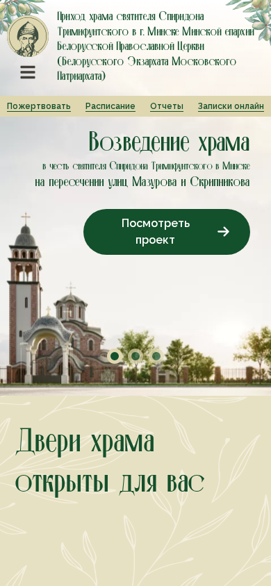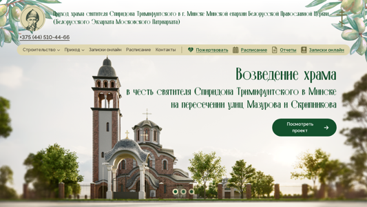 This website is for the parish of the Orthodox Church of Saint Spiridon Trimifuntsky in Minsk. The unique Orthodox church is being built in honor of Saint Spiridon Trimifuntsky in the city of Minsk, part of the Minsk Eparchy of the Belarusian Orthodox Church (Belarusian Exarchate of the Moscow Patriarchate). The site includes information on the construction process, project details, news, and how to help with donations. The church is located at the intersection of Mazourova and Skripnikova streets in Minsk. The doors of the church are open daily from 9:00 to 19:00 at the address: g. Minsk, ul. I. Shamyakina, 16/1. Construction videos and 3D visualizations of the future temple