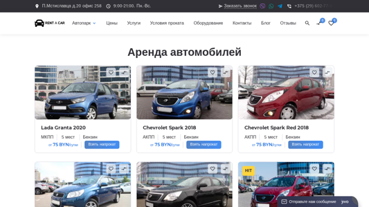 | AI-анализ | The website is a car rental service based in Minsk, Belarus. It offers a wide range of vehicles for rent, including sedans, microbuses, minivans, SUVs, and vans. The website supports 24/7 customer service and offers prices starting from 59 BYN per day. Customers can quickly and easily make reservations, with multiple methods of payment available. The website also offers a free navigator and child seat. The contact number is +375 29 602 77 99. The website has a car park section where users can filter vehicles by type, class, and brand. The available brands include Geely, BMW, Audi, Mercedes, Volkswagen, Volvo, Ford, Lada, Renault, KIA, Jaguar, Chevrolet, Skoda, Hyundai, Buerst |