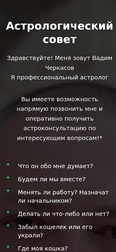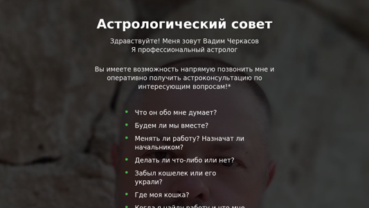 | AI-анализ | This online resource, titled "Астрологический совет Вадима Черкасова" (Astrological Council of Valery Cherkasov), is a professional astrology consultation service. The site owner, named Valery Cherkasov, offers direct phone consultations for various inquiries. Users can call him to discuss topics such as career, relationships, work-life balance, and personal concerns. The keywords indicate that people often ask about love, work, time management, and finding their path in life. The site also offers an online consultation booking system at <https://www.express-sovet.by/>, with the expert's code being 250. The service is payable, with pricing information provided on the linked platform. Users can also contact the expert via Telegram during working hours. |
