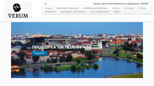 | AI-анализ | This website is the homepage of the "VERUM" Center for the Evaluation of Information Reliability. The title of the website is "Центр оценки достоверности инformationи 'VERUM'" which translates to "VERUM Center for Information Reliability Evaluation". The description is not provided but keywords include "оценки" (evaluations), "достоверности" (reliability), "информации" (information), and "верум" (VERUM). The website appears to offer services related to information reliability evaluations and possibly polygraph testing based on the top words "проверка на полиграфе" (polygraph test) and "полиграфе" (polygraph). Other services mentioned are "услуги" (services), "обучение" (training), and "дипломы" (diplomas) and "сер |