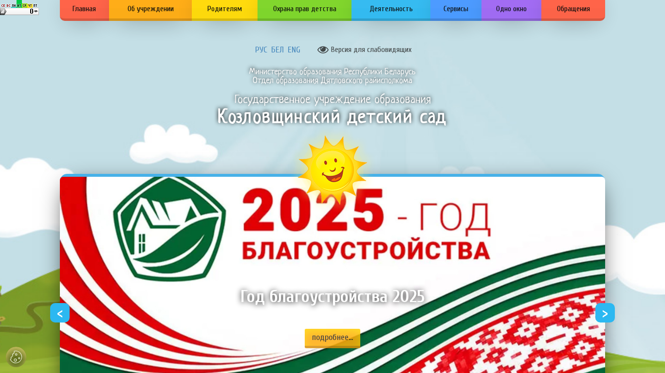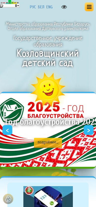 | AI-анализ | --- The portal kozlovshina-ds.roodyatlovo.by is dedicated to the 'Козловщинский детский сад' (Kozlovschina Children's Day Care) in Belarus. Key topics on the site include the institution's administration, educational program, licensing information, and contacts for various departments. The site features news updates, a primary trade union, and a parental support section. The site also provides information on the institution's history, traditions, and achievements, as well as its approach to safety, health, and anti-corruption measures. The site offers recommendations for specialists, including teachers for children with special needs and a musical director. There is also information on home-based education and a prospectus for future services. The site is organized with sections for the institution's leadership, pedagogical staff, and various regulatory documents. The site also |