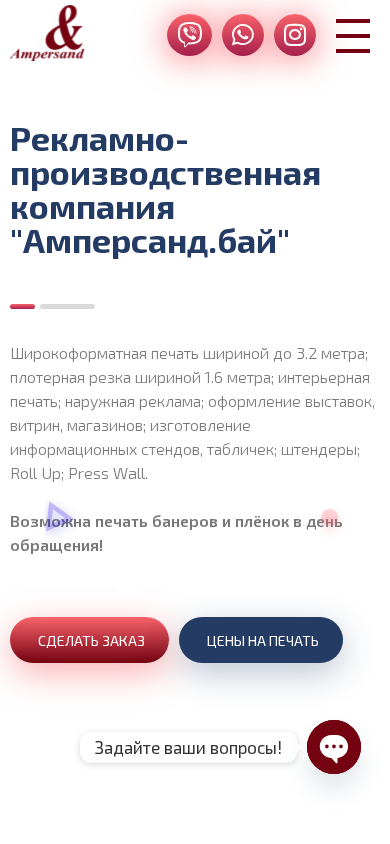 | SEO-описание | Рекламно-производственная компания «Амперсанд.бай» Широкоформатная печать шириной до 3.2 метра; плотерная резка шириной 1.6 метра; интерьерная печать; наружная реклама; оформление выставок, витрин, магазинов; изготовление информационных стендов, табличек; штендеры; Roll Up; Press Wall. Возможна печать банеров и плёнок в день обращения! Сделать заказ Цены на печать Бесплатная консультация +375 29 135-51-06 Пн-пт с 9:00 до 17:30 нам […] |
