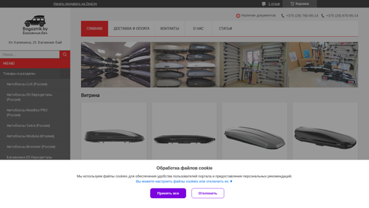 | AI-анализ | --- This online resource is a specialized store named "Ул. Калинина, 25. Багажник бай" that sells automobile baggage carriers. The store offers various brands of baggage boxes and trunks, including LUX, ED Евродеталь, MaxBox PRO, Sotra, Modula, Broomer, Turtle, and Amos, among others. Additionally, the store sells bags for microbuses, trunks for Vivaro, and Velobagages for fenders, roofs, trunk lids, and bumpers. The store also offers attachments for skis and snowboards. The contact information includes Maxim Akulich, the proprietor, located at Ul. Kalinina, 25, in Minsk, Belarus. The phone numbers are +375 (29) 760-9 |