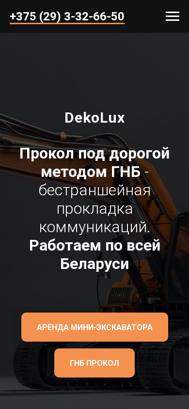 | AI-анализ | --- The web project "DekoLux" is a rental service for mini-excavators and trench boring in Mogilev, Belarus. The company offers trench boring services using the Horizontal Directional Drilling (HDD) method for the installation of communication lines. They operate throughout Belarus and provide services for mini-excavator rental, trench boring, and drilling of wells. Clients can submit an inquiry and expect a response within 15 minutes. The team assesses the project site and agrees on the pricing and timeline. After the contract is signed, the team commences drilling in the agreed timeframe. The services are characterized by professionalism, quality, reliability, and individual attention to each client. Mini-excavators in excellent condition are available for rental. |