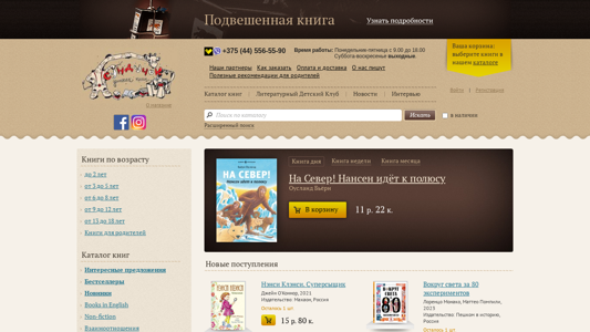 | AI-анализ | The website "Сундучок детских книг" (Sunduchok Detskikh Knig, Sunduckok of Children's Books) is an online bookstore specializing in children's literature. The main categories of books offered include fiction, non-fiction, and educational titles. The store has a wide selection of books for various age groups, from toddlers to teenagers. Some categories include books for parents, poetry, and calendars. The website provides information on the publisher and author for each book. It also features interviews, news, and useful resources for parents. The store offers delivery and has a section for gift books and certificates. The website is available in Belarusian and offers books in various genres and formats, including audiobooks and e-books. The store's contact information is provided, along with operating hours and a registration and login system for |