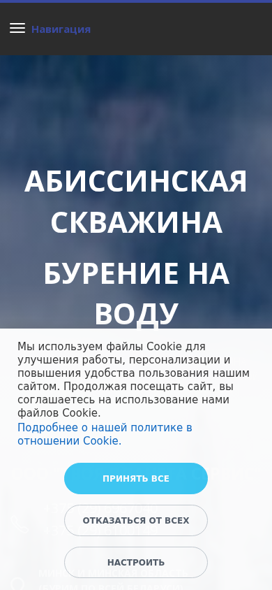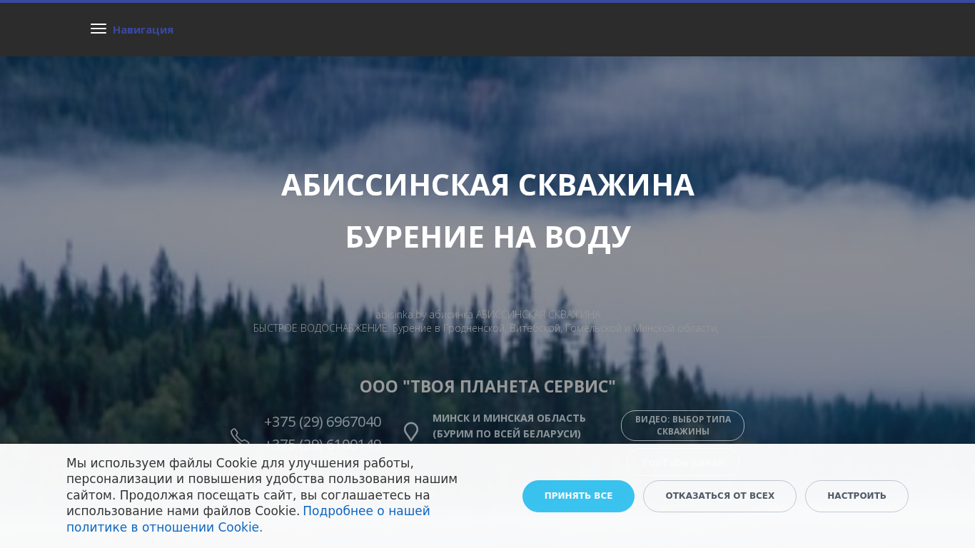| AI-анализ | --- The portal abisinka.by is about drilling and abissinian wells. It provides information on what abissinian wells are and offers services for drilling and equipment sales. The website mentions quick water supply in Grodno, Vitsebsk, Homel, and Minsk regions, and contacts for the company "Your Planet Service" in Minsk. A YouTube channel for videos on the topic of abissinian wells is available. The site offers drilling services up to a depth of 15 meters, with prices starting at 1000 rubles. The company also sells 32mm polymer filters. |