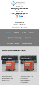 | AI-анализ | --- The website is for Ecosmartservis, a Belarusian company based in Minsk that produces and sells thermal fluids, glycols, refrigerants, water-glycol solutions, and antifreeze agents. They offer delivery throughout Belarus with volume discounts. The website includes a catalog of their products, including thermofluid Monotherm and Protherm, and information about their production of refrigerants and fluids for airport deicing. The company also offers services such as hydraulic diagnostics and rules of exploitation. Contact information is provided for both individual and corporate customers, along with delivery and payment details. The website is available in Russian and includes recommended products for hight quality thermal fluids, glycols, refrigerants, and antifreeze agents. The company is a leading producer of thermal/refrigerant fluids in Belarus. |