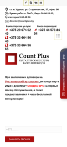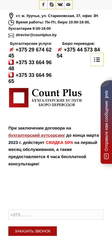 | SEO-описание | Оказание бухгалтерских услуг в Минске - компания "Каунт Плас". Услуги бухгалтерского учета для организаций и ИП. Стоимость оказания услуг уточняйте у по телефонам, указанным на сайте. |