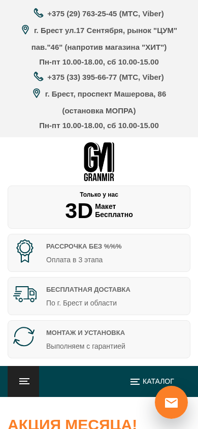 | AI-анализ | --- The web project "GranMir" offers memorials in Breste made of granite at affordable prices, with photos and pricing information. Custom-made memorials with installation on the cemetery are available at low prices, including free delivery and financing options. The company specializes in various types of memorials, such as single and double ones, as well as complexes, with options for different materials for the base and various accessories like vases, lamps, and statuettes. The website features a blog and a catalog, and the contact information includes two locations in Breste, with different opening hours. |