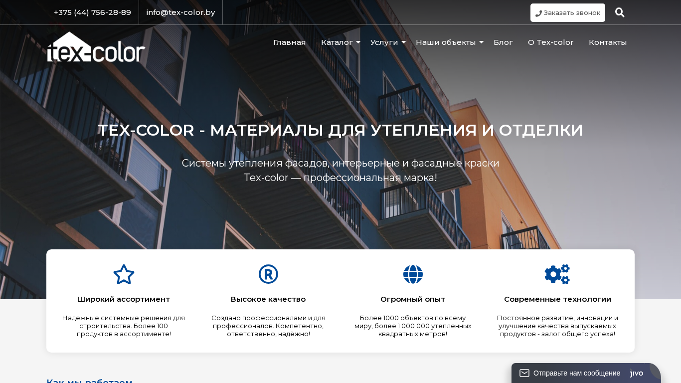 | SEO-описание | Каталог товаров для утепления, фасадных и внутренних работ, купить оптом и в розницу в Минске с доставкой: грунтовки, краски, декоративные штукатурки. Tex-color в Беларуси |
