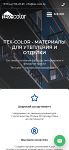 | AI-анализ | The portal Tex-Color offers a catalog of products for insulation, facade and interior works in Belarus. Buy optically and retail in Minsk with delivery: groundworks, paints, decorative interior plasters. Tex-Color in Belarus. Keywords: Tex-Color, insulation, paints, systems, materials, plasters, facade, interior, choose color, 375, 756-28-89, info. The website provides information on Tex-Color's range of insulation systems for facades, interior paints, decorative plasters, and related materials. Users can purchase these products optically or retail in Minsk with delivery. The website also offers a contact number, an order form for a callback, and a blog. Tex-Color is a professional brand with a wide assortment of reliable system solutions for construction. The company |