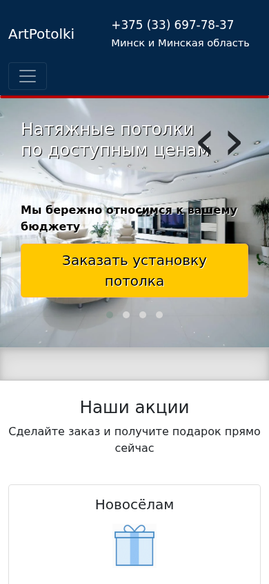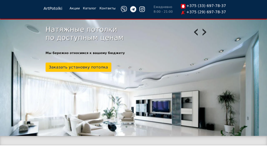 | AI-анализ | --- This online resource, titled 'artpotolki.by - Натяжные потолки', offers information about and facilitates the purchase of stretch ceilings in Minsk and the Minsk region. Keywords associated with the site include 'потолки' (ceiling), 'натяжные' (stretch), 'artpotolki', 'минская' (Minsk region), and various words related to purchasing, prices, and installation. The site features contacts for the company, including phone numbers for Minsk and Viber, Telegram, and Instagram. It also mentions an action with a 10% discount on the purchase of a luminary and offers consultations on affordable stretch ceilings. The site promises quick measurement and installation, as well as financing options with no bank involvement or fees. The company offers various types of stretch ceilings, including |