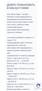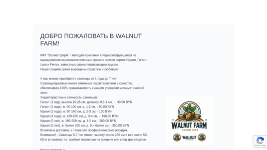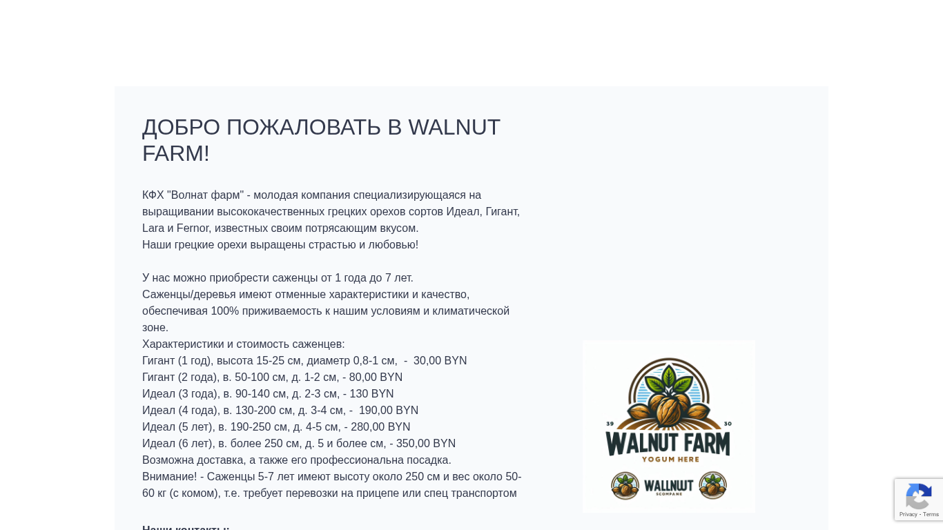 | AI-анализ | This online resource is the official website of "Волнат фарм" (Walnut Farm), a young Belarusian agricultural company specializing in the cultivation of high-quality Persian walnuts, specifically the varieties Ideal, Giant, Lara, and Fernor, known for their exceptional taste. The company offers walnut saplings ranging from one to seven years old, all of which exhibit excellent characteristics and quality, ensuring a 100% survival rate in the given climate and conditions. The sapling sizes, heights, and prices are as follows: Giant (1 year) - 30.00 BYN, Giant (2 years) - 80.00 BYN, Ideal (3 years) - 130 BYN, Ideal (4 years) - 190.00 BYN, Ideal (5 |