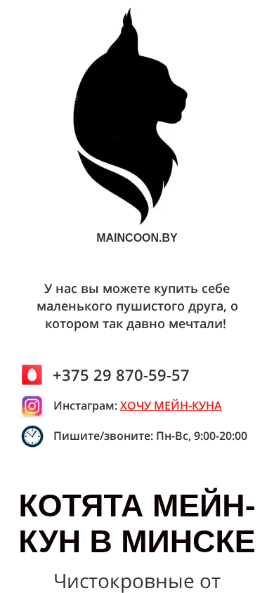 | AI-анализ | --- This website is an online shop selling Main Coon kittens in Minsk, Belarus. Customers can purchase these pedigree cats at affordable prices by contacting the provided phone numbers on the site. The website includes a list of reasons why one should buy a Main Coon kitten from them, such as the kittens not scratching or biting humans, being trained to use a litter box and scratching post from an early age, and not requiring a costly litter tray. The website also states that the kittens are weaned and can be found on their Instagram account, where customers can write or message them directly or via the phone number listed on the site. The website includes the top words 'котята', 'котенка', 'мейн-куна', 'поэтому', 'котят', 'руками', 'будет', 'вас', |