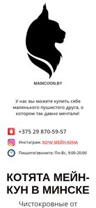 | SEO-описание | У нас вы можете купить породистых котят мейн-кун в Минске по доступным ценам. Чтобы выбрать подходящего котенка, обратитесь по контактным телефонам, которые вы видите на сайте. |