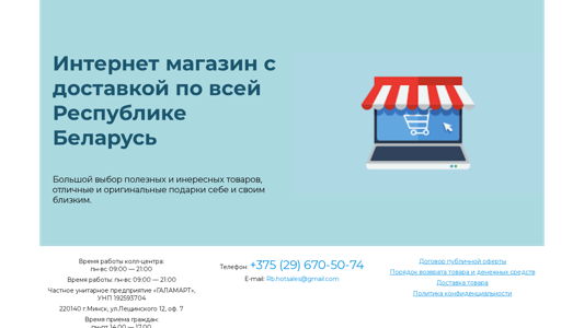 | AI-анализ | This online resource is an e-commerce website named Topsale, which offers various goods for customers' comfort in Belarus. The website guarantees quick delivery across the entire country, convenient payment methods, and excellent customer service. The Internet shop has wide selection of useful and interesting items, as well as original and thoughtful gifts for oneself and loved ones. The customer service center operates from Monday to Sunday, 09:00 to 21:00. The business is registered as a private enterprise, "Galamart," with the Unified State Register of Enterprises number 192593704, located in Minsk, Leonid Leщинского Street 12, Office 7. The office hours for accepting visitors are Monday to Friday, 14:00 to 17:00. The contact details are a phone number, +375 |