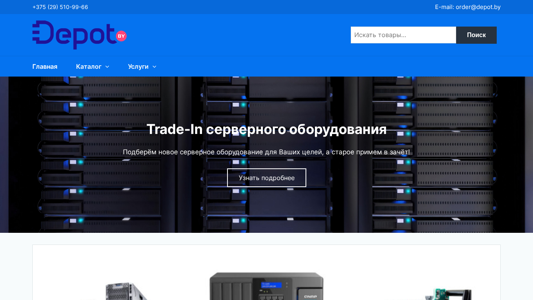| AI-анализ | This online resource, Depot.by, is an e-commerce platform specializing in IT equipment sales. The website offers server equipment, data storage systems, server components, networking devices, power sources, software, and services. Brands supported include Lenovo, Dell, HP, and Huawei. The site provides a service for trading in old server equipment. The main menu includes sections for catalog, cart, and services. The catalog is further divided into server equipment, data storage systems, server components, networking devices, power sources, and software. Services include servicing Lenovo, Dell, HP, and Huawei equipment. The cart is currently empty. Recommended products include a 3kVA/2.7kW online UPS system and a 2000VA 2.57kW UPS system. Other products include a managed 2-level 48-port switch |