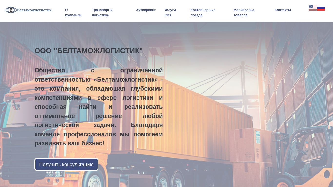 | AI-анализ | This website is for Belarusian logistics company "Белтаможлогистик" (Beltazhlogistik), which offers various transport and logistics services with a focus on container transportation and rail freight. The company's services include outsourcing of import and export operations, container trains, and customs logistics. Their capabilities enable them to optimize supply chain solutions and handle diverse cargo types. The company's contact information is provided, including phone numbers for the director and assistant director. The website is in Belarusian language, with some English phrases for international clients. The domain is btlogistik.by. |