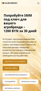 | AI-анализ | The website agromediya.by offers social media marketing services for agricultural businesses. The website provides a form for potential clients to submit their product or business category and inquire about prioritized services, such as increasing brand awareness, boosting sales, strengthening reputation, or entering new markets. The website mentions a 24/7 contact availability and offers a free consultation. The pricing for a 30-day SMM strategy starts from 1,200 BYN, with an option for a test run for 1,000 BYN. The website also lists some examples of their previous clients in the agriculture industry, including a meat processing plant and a bakery. The website is currently considering expanding to Instagram, TikTok, and VK in addition to their existing website presence. The website does not mention having a budget for promotion or if they are currently active on any social media platforms. |