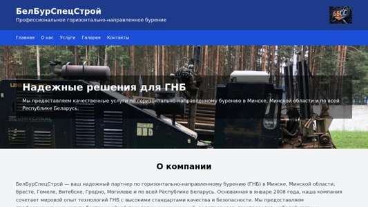 | AI-анализ | url: https://bbss.by/ This online resource, titled "ГНБ в Беларуси | БелБурСпецСтрой" (GNB in Belarus | BelBurSpecStroy), is a website dedicated to providing professional services related to horizontal directional drilling (HDD) or trenchless technology for the installation of various communication networks such as water, gas, cables, and sewage systems in Belarus. The company, BelBurSpecStroy, offers reliable solutions for HDD in cities like Minsk, Minsk region, Brest, Gomel, Vitsebsk, Grodno, and Mogilev, and throughout the entire Republic of Belarus. Founded in January 2008, BelBurSpecStroy combines international expertise in HDD technology with high standards of quality |