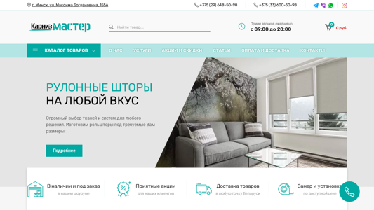 | AI-анализ | The web project "Karniz Master" is an e-commerce store based in Minsk, Belarus, selling various types of window and door frames, including carpentry for curtains, rollers, and related components. The store offers delivery and installation services, catering to different types of mounting methods, and provides discounts and warranties. The phone numbers for customer inquiries are +375 (29) 648-50-98 and +375 (33) 600-50-98, with daily operating hours from 09:00 to 20:00. The product catalog includes metallic, track, profile, and ceiling carpentry, as well as carpentry for Roman blinds, metal-plastic, and flexible carpentry. Mini-carpentry for cafes is also available |