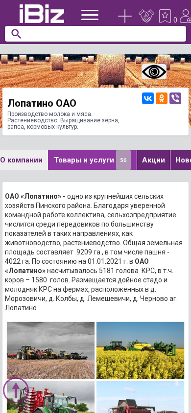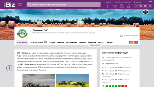 | AI-анализ | This website is for the agricultural company, LOAPATINO OAO, located in the town of Sovietskaya, Agroterritory of Loapatino, Belarus. The company specializes in dairy and meat production as well as agriculture, focusing on the cultivation of grains, rapeseed, and fodder crops. The website provides information about the farm's location, contact details, and offers various products and services related to agriculture, including livestock, farming equipment, and farming-related news and announcements. Keywords include "лопатино," "375," "услуги," "растениеводство," "крс," "молока," "оао," "производство," "сельское," and "хозяйство." The company's agricultural land covers 9209 hectares, |
