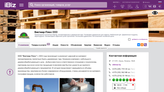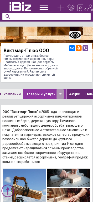 | AI-анализ | The web project "Victmar-Plus OOO" is a wood processing company specializing in the production and sale of pallet boards, pine boards, and wooden packaging. The company also offers a wooden platform for terraces, a wooden panel for furniture, wooden pallets and Euro pallets, and sawn timber. The production process includes sawing and cutting dry, planed timber. The company also manufactures firewood. The company's address is 211391, Orsha, Lenina, 186A. No contact information was provided in the given data. |